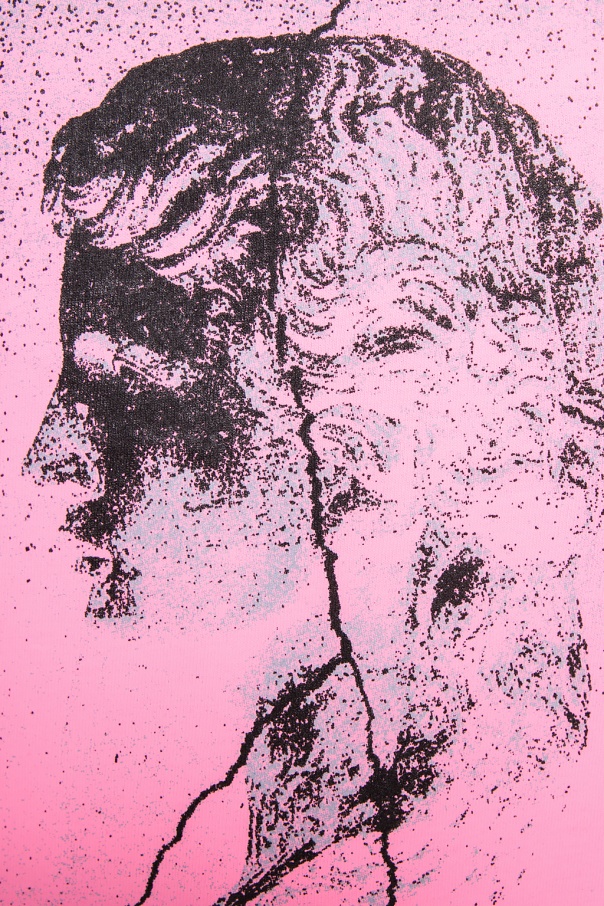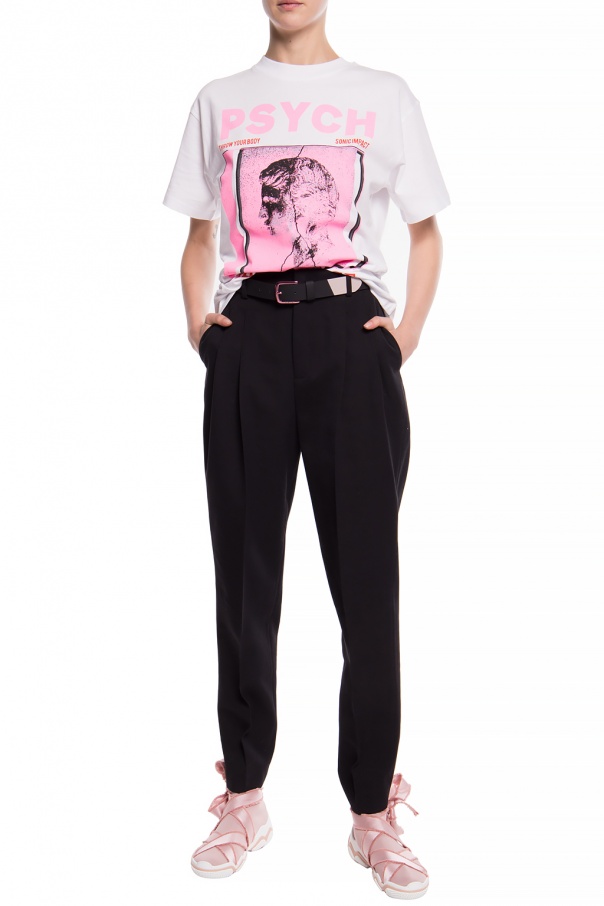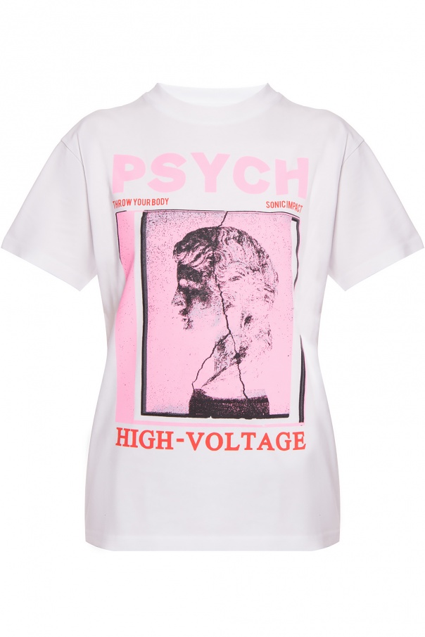 White T-shirt from McQ Alexander McQueen. Made of cotton. Decorated with pink and green prints. Round neck.