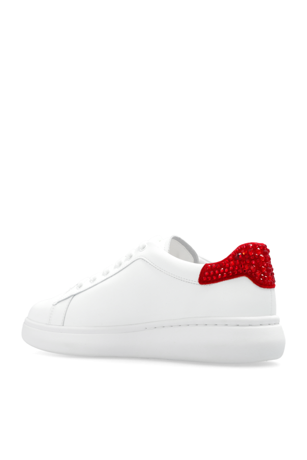 White ‘Lift’ sneakers from Kate Spade. Made of leather, this lace-up pair sits on a white rubber sole and features a tactile logo on the side and a red heel counter embellished with crystals.
