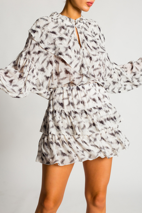 Cream and black dress from Iro. Crafted from a sheer fabric blend with an all-over pattern, this style features a mock neck with a button closure, a shirred waist and gold-tone and silver-tone lurex threads throughout.