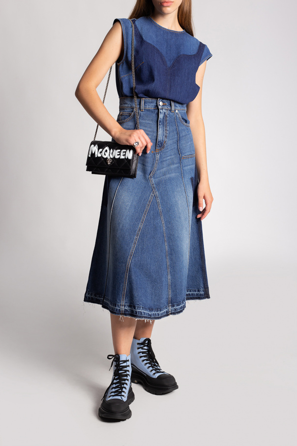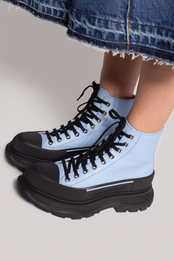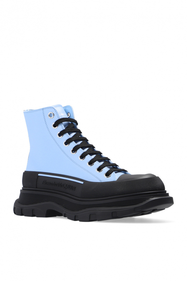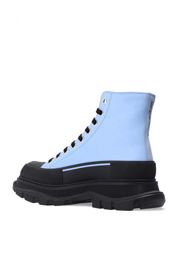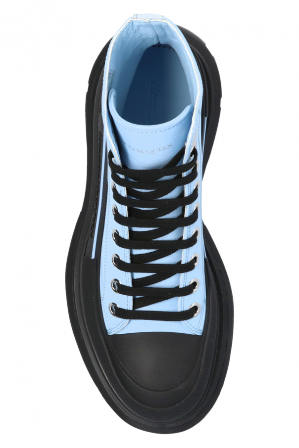 Blue and black high-top platform sneakers from Alexander McQueen. Set on a black rubber sole, this lace-up pair features a silver-tone logo printed on the tongue and a grosgrain pull strap with a logo.