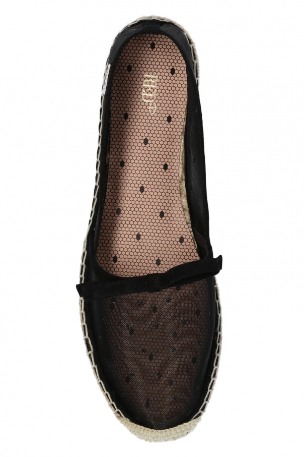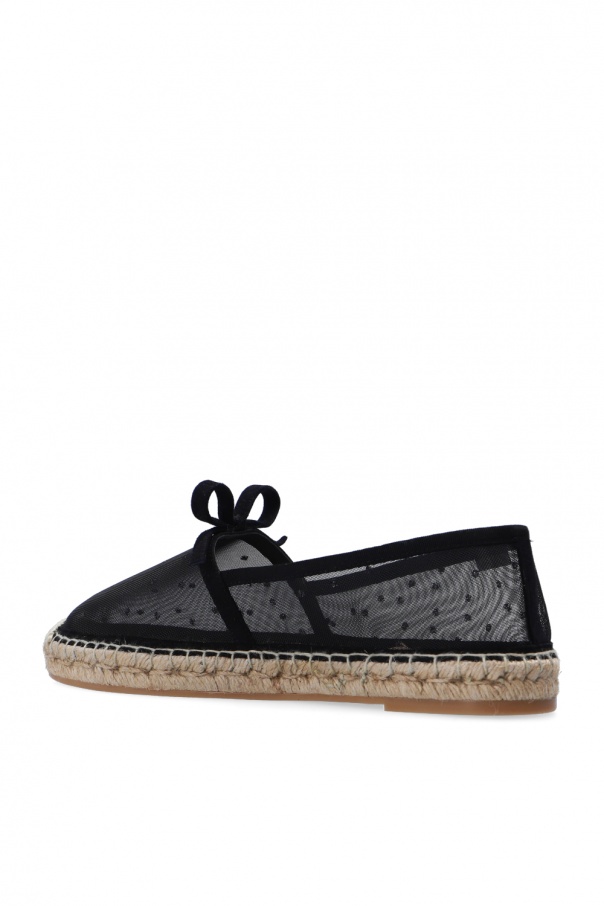 Black transparent espadrilles from Red Valentino. Trimmed with suede, this design features a decorative bow, black and silver-tone print and beige rubber sole.