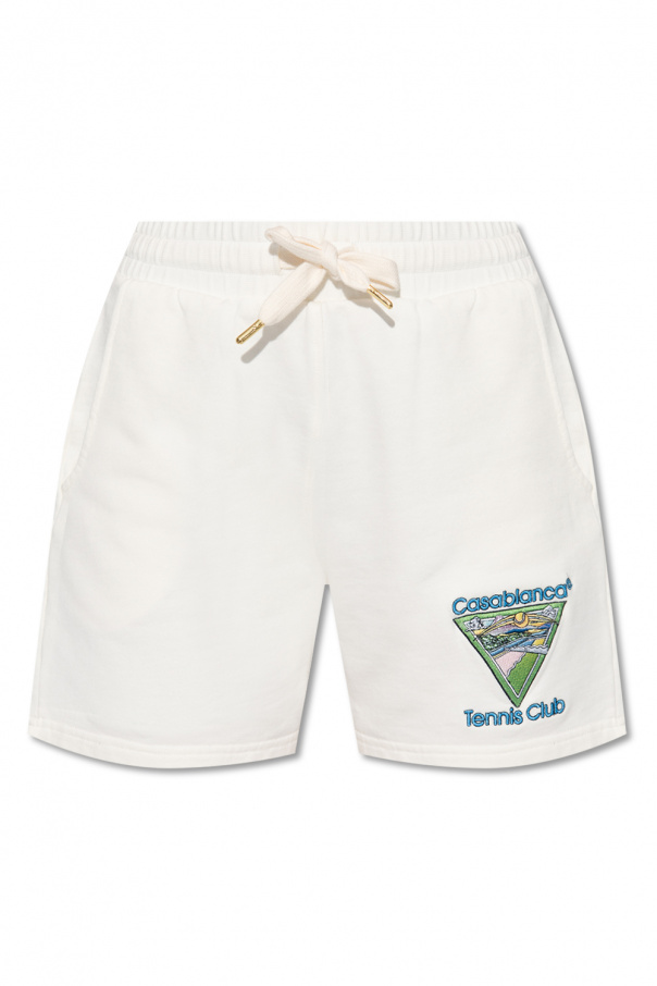 White shorts from Casablanca. Made of high-quality organic cotton, this pair features a drawstring waist, multicolored ‘Tennis Club Icon’ patch inspired by the world of tennis, two front pockets and one back pocket.