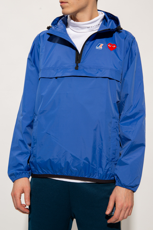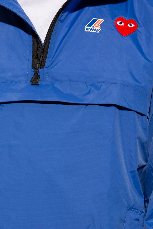 Blue and black rain jacket from Comme Des Garçons Play x K-Way. Emblazoned with a logo patch and a printed logo, this style features a zip fastening, a drawcord-adjustable hood, long sleeves and three zipped pockets on the front.