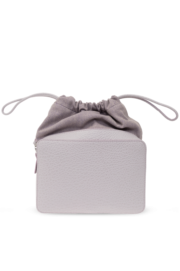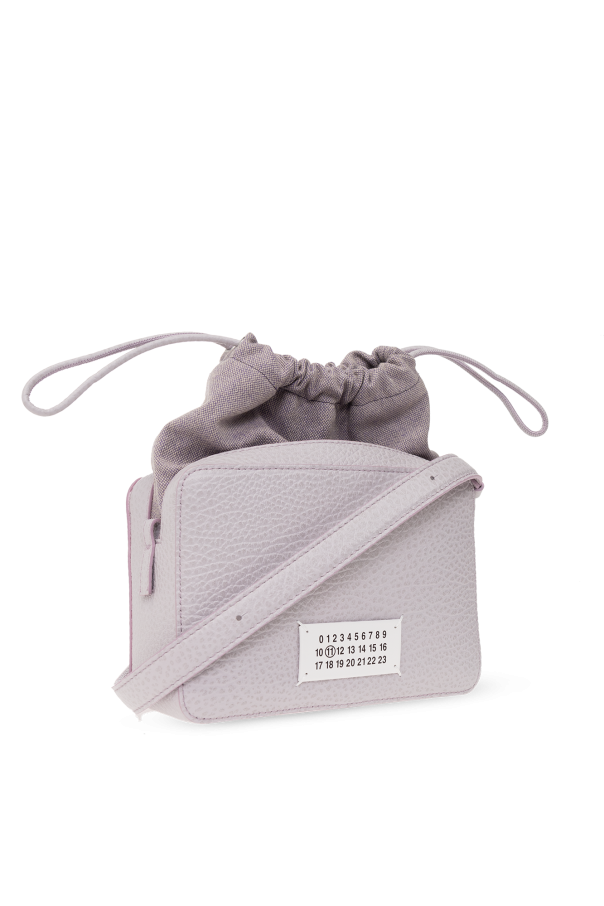 Light purple ‘5AC Small’ shoulder bag from Maison Margiela. Crafted from leather and cotton, this design cinches closed with drawstrings and features the brand\'s signature white logo patch on the front. It is complete with a detachable and adjustable shoulder strap, silver-tone metal hardware and one internal compartment with one zip pocket and one slip pocket.
