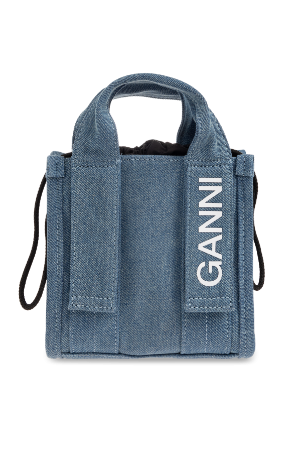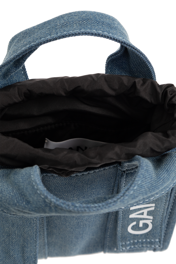 Blue shoulder bag from Ganni. Made from recycled materials, this design features a black interior cinched with drawstrings on the sides, two half-round handles with a logo, silver-tone metal hardware as well as a black rubber logo patch on the side and a detachable and adjustable shoulder strap.