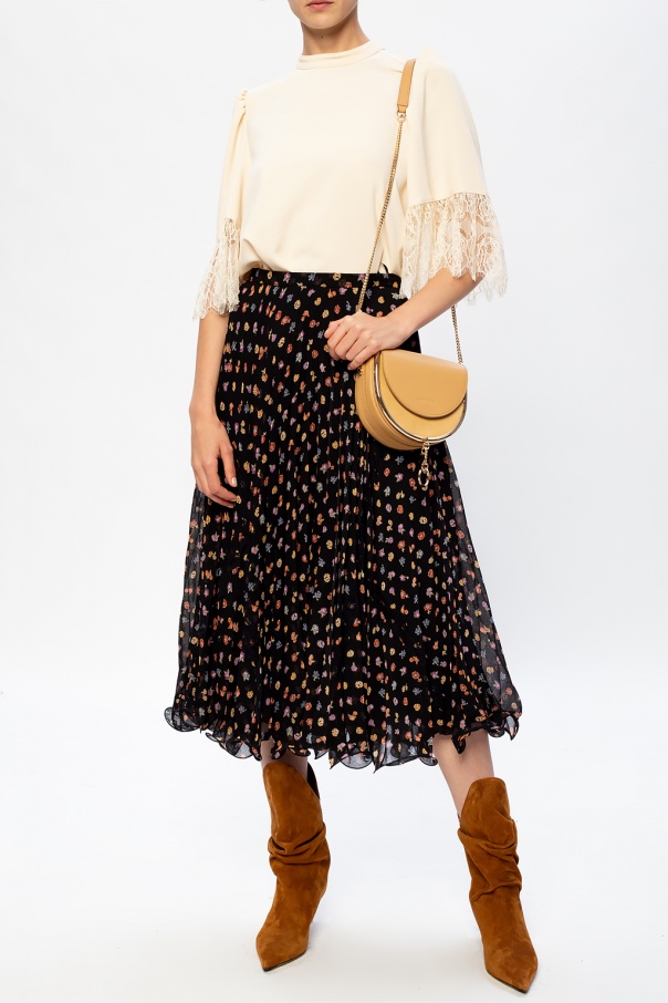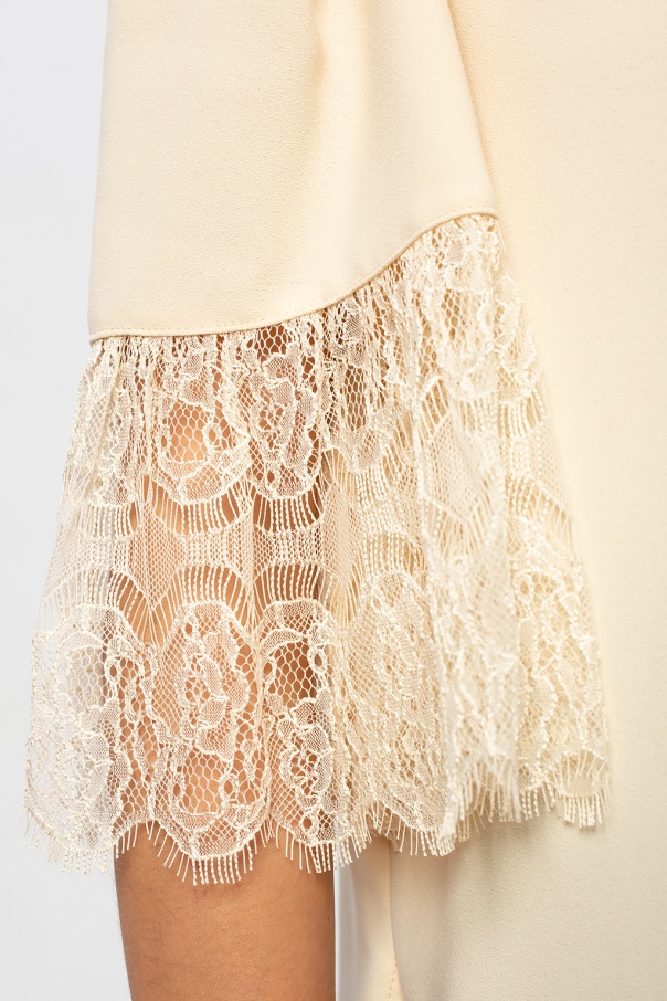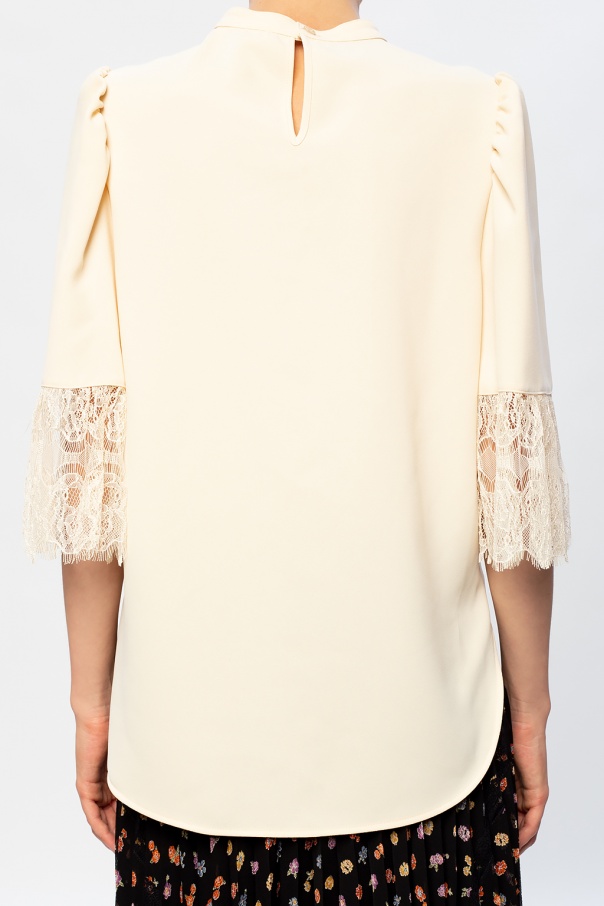 Cream top from See By Chloé. Emphasized with lace accents on the sleeves, this style has band collar and side vents.