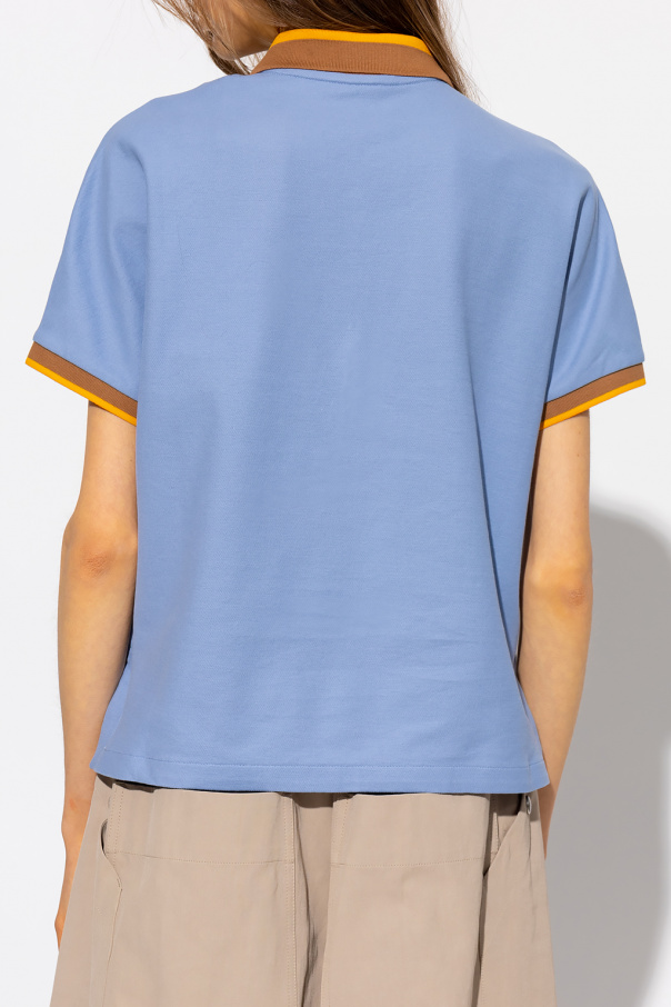 Blue polo shirt with short sleeves from Moncler. Made of cotton, this style features snap-button placket, an embroidered logo on the front and brown and yellow elastic trims on the collar and cuffs.