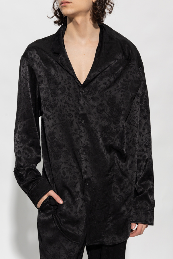 Black loose-fitting shirt from Y/Project. Fastened with buttons, this design features a floral pattern, collar, decorative trimming and long sleeves with buttoned cuffs.