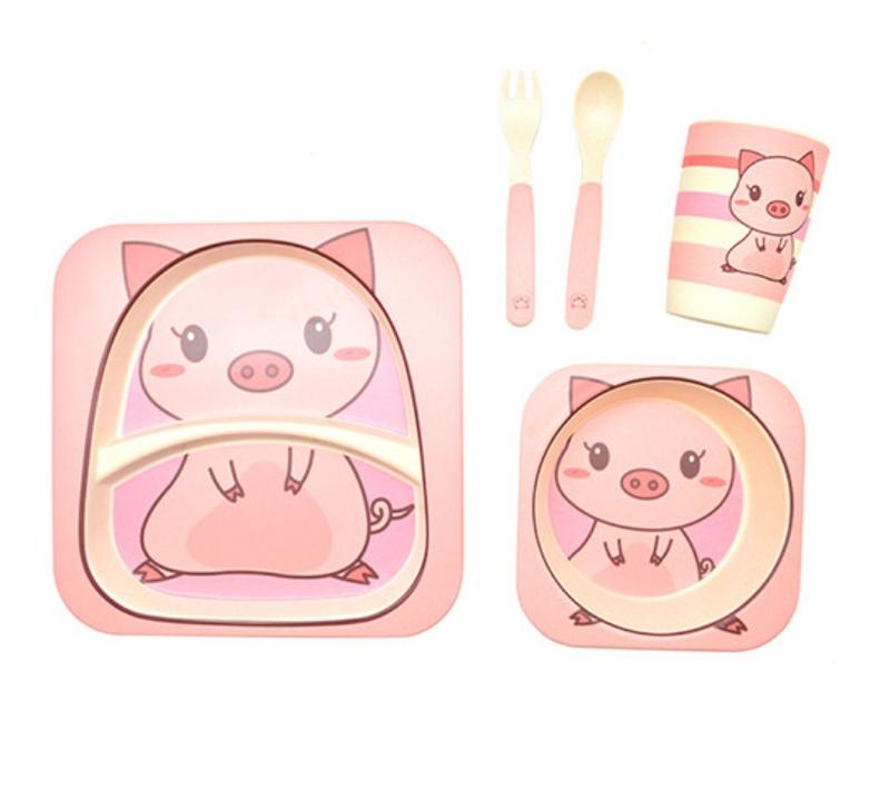 Набор детской бамбуковой посуды Хрюша состоит из 5 предметов: ложка, вилка,