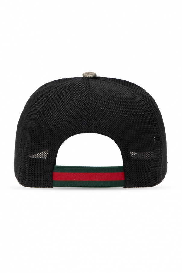 Beige, brown and black baseball cap from Gucci Kids. Emblazoned with a logo-embossed patch and a green, red and yellow pattern, this piece of headwear is complete with an elastic trim on the back.