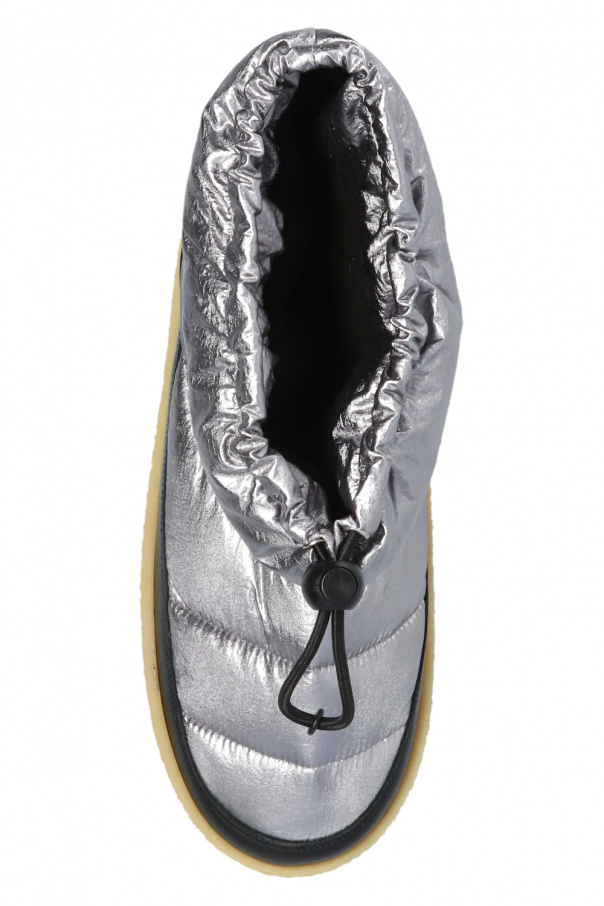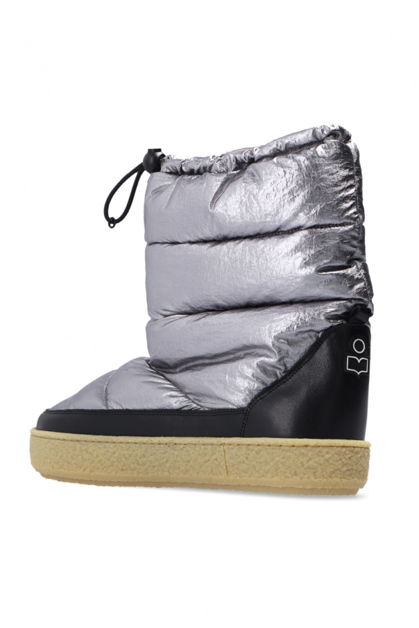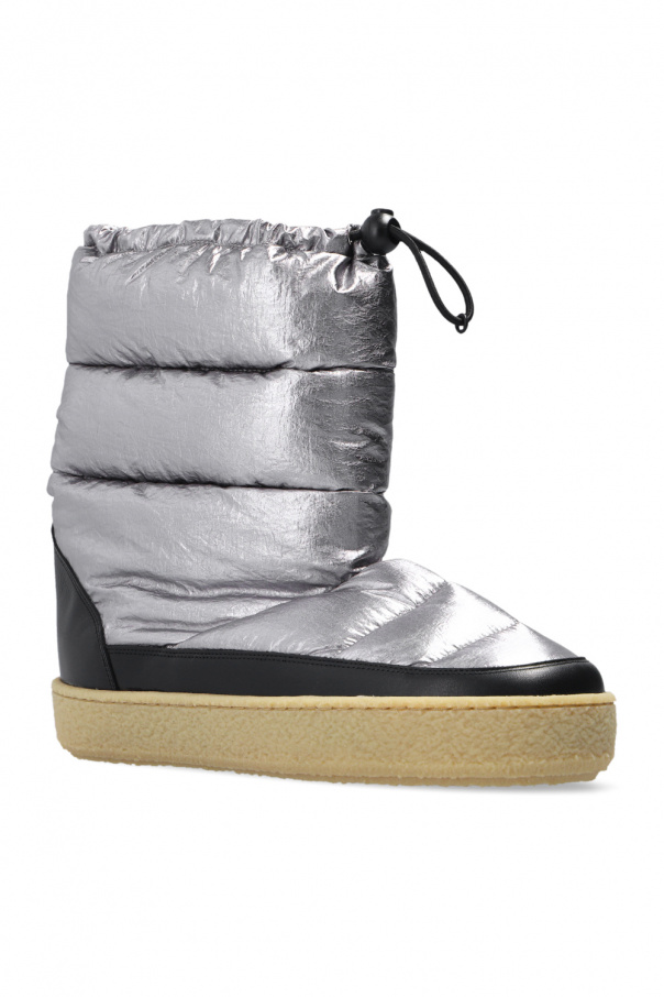 Grey ‘Zerik’ metallic snow boots from Isabel Marant. Finished with black leather, this model sits on a beige rubber sole and features a drawstring closure and a rubber logo appliqué on the back.