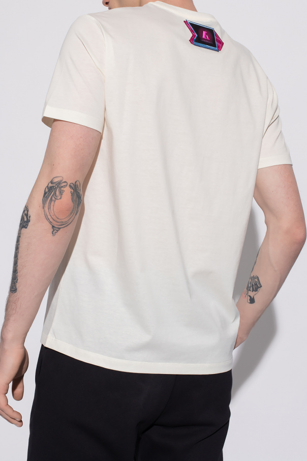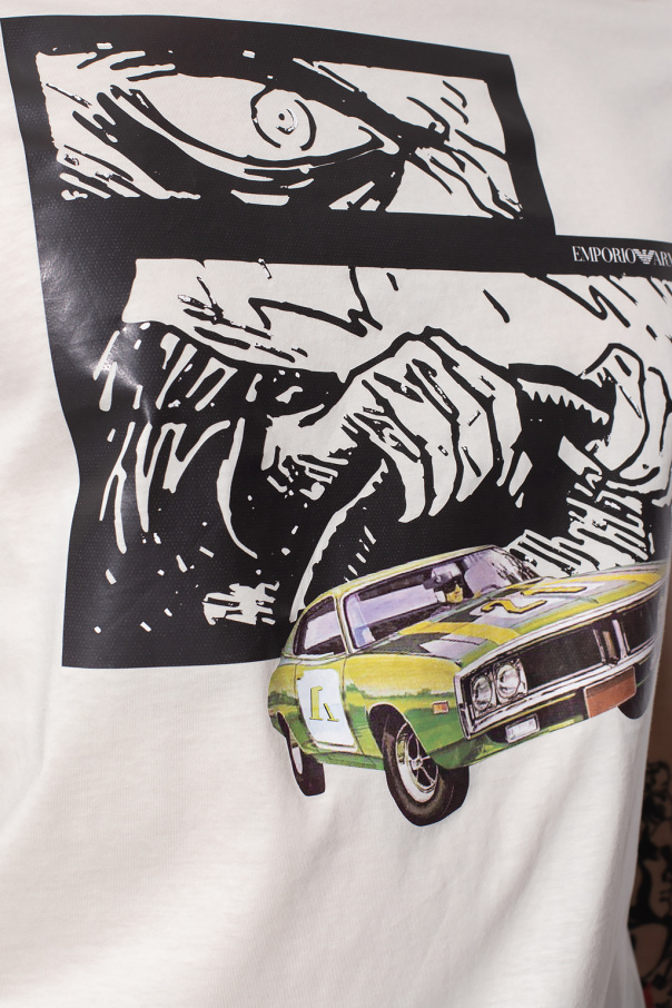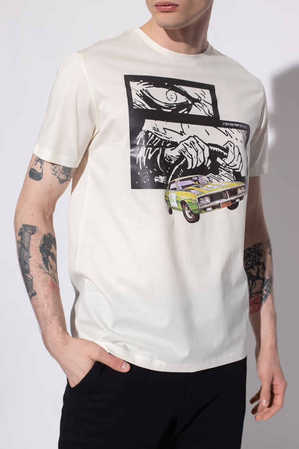 Cream crewneck T-shirt from Emporio Armani, the ‘Racing’ collection. Made of cotton, this style showcases short sleeves, an elasticated collar, a colourful graphic print and a logo patch.