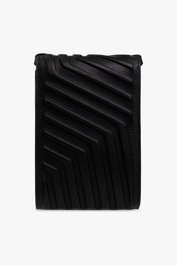 Black ‘Car’ phone pouch from Balenciaga. Made of calf leather, this model features a magnetic snap, raised geometric pattern, white logo print and adjustable, detachable shoulder strap.