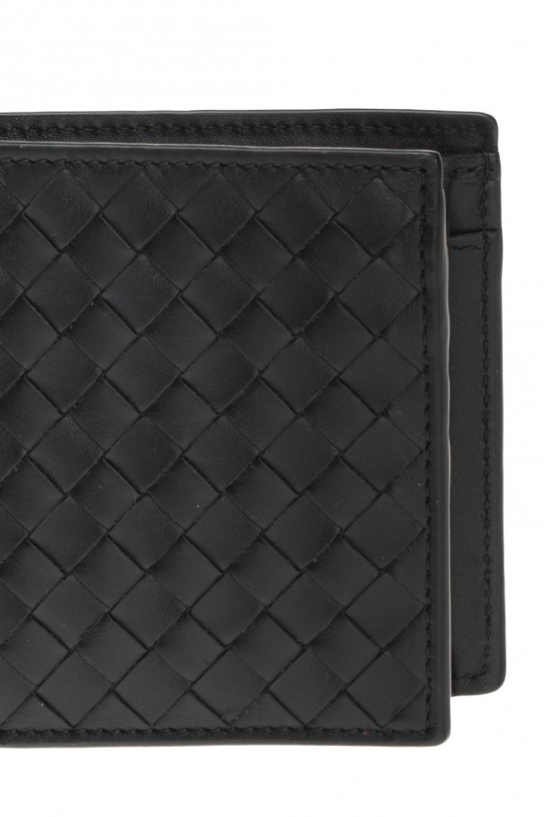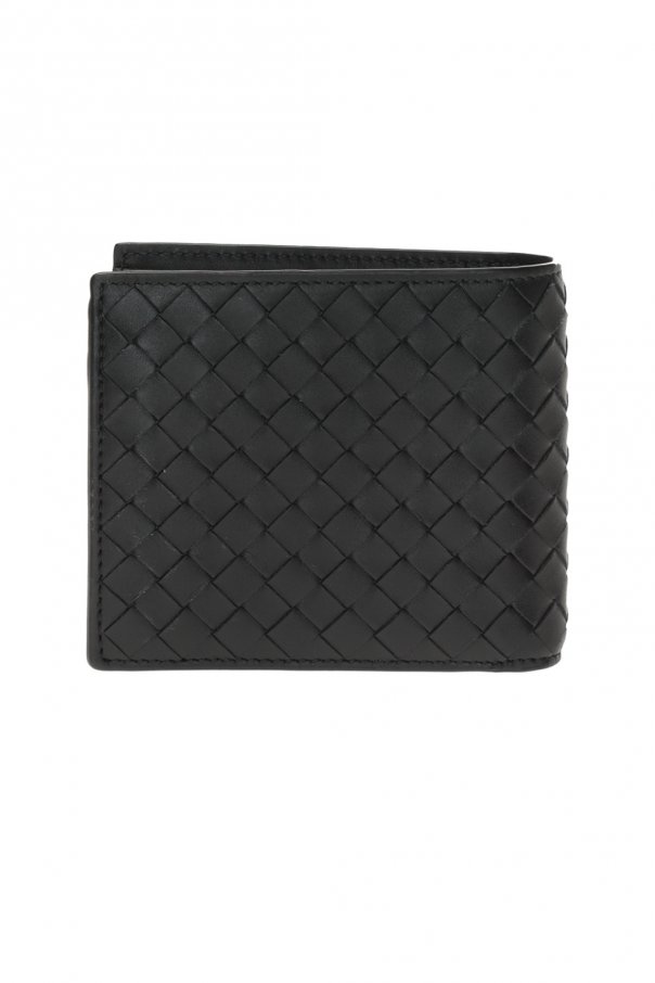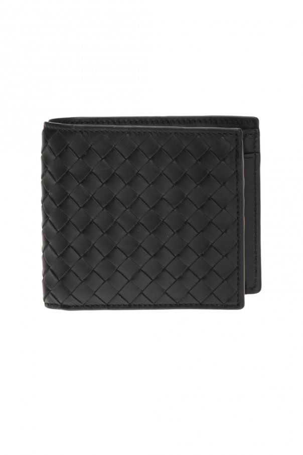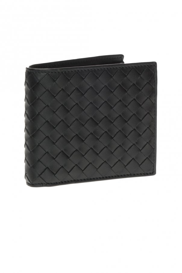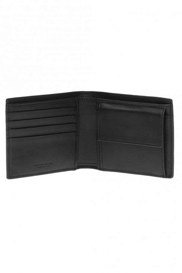 Men's Bottega Veneta wallet, made of calf leather, in black colour. Two bill compartments, coin pocket with a stud clousre, four credit card slots and two additional compartments inside.