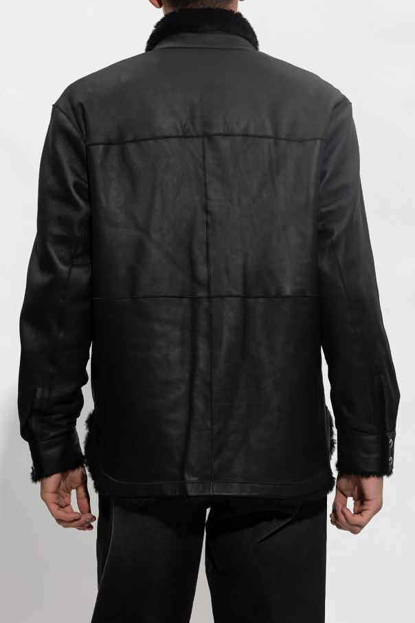 Black ‘Holmy’ reversible shirt jacket from Iro. One side is made of lamb leather, the other – of lamb wool. Fastened with snaps, this garment has snap fastenings, four pockets on each side and long sleeves with snap-fastened cuffs.