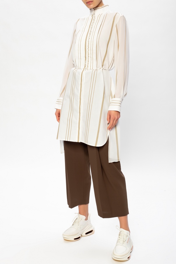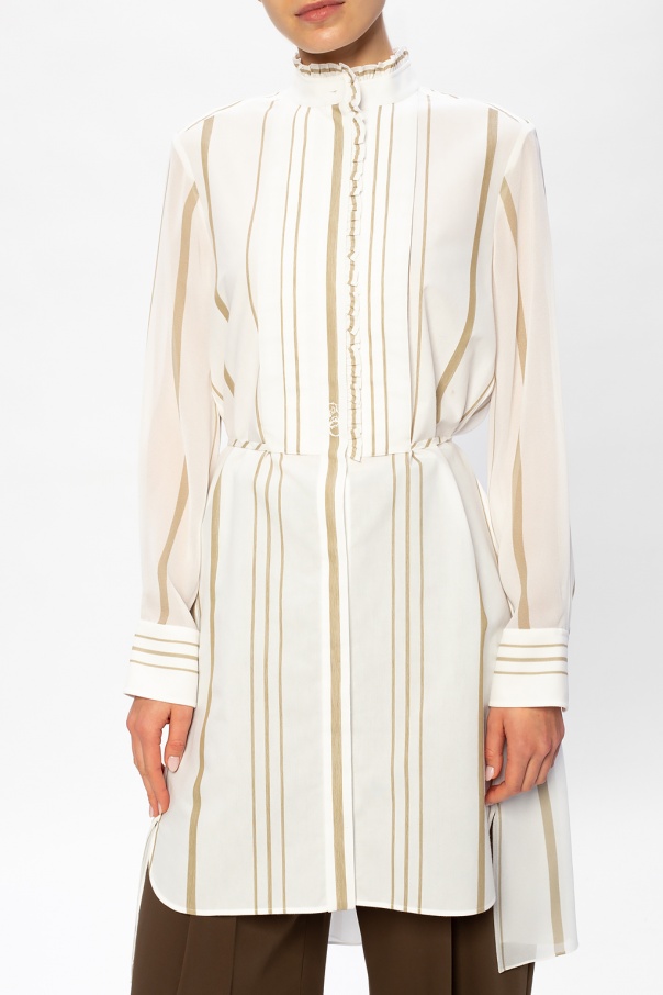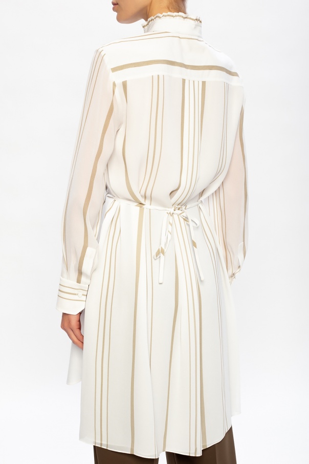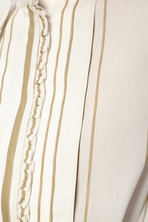 White and beige dress from Chloé. Woven from cotton with stripes, this long-sleeved style secures with buttons and a self-tie belt and showcases gathered details and a logo embroidery.