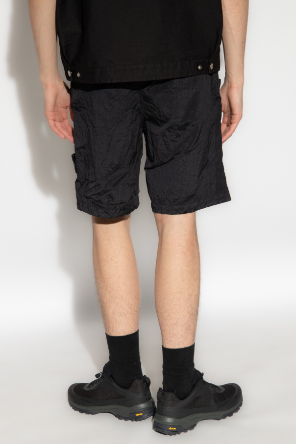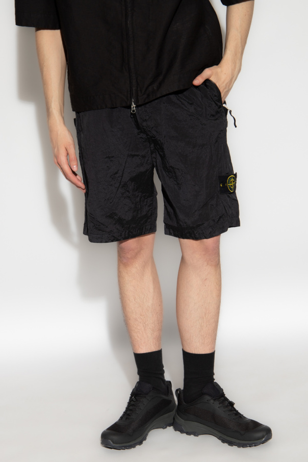 Black track shorts from Stone Island. Emblazoned with a detachable logo patch, this pair features a drawstring waist, a zip fly, two front zip pockets and one back snap-fastened pocket.