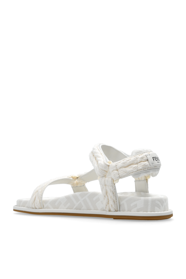 White and cream sandals from Fendi. Crafted from fabric and leather, this model sits on a beige rubber sole and showcases a monogram pattern and a velcro closure.