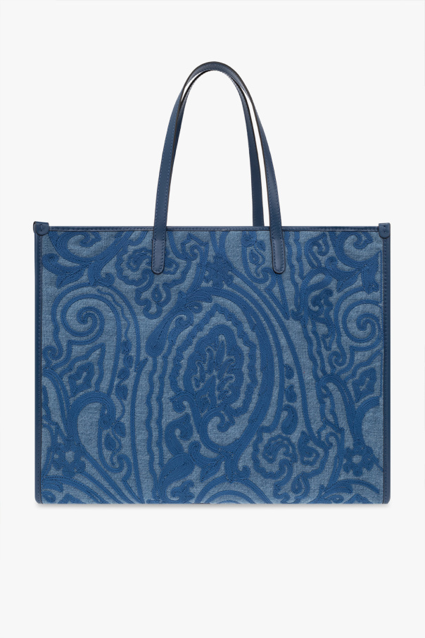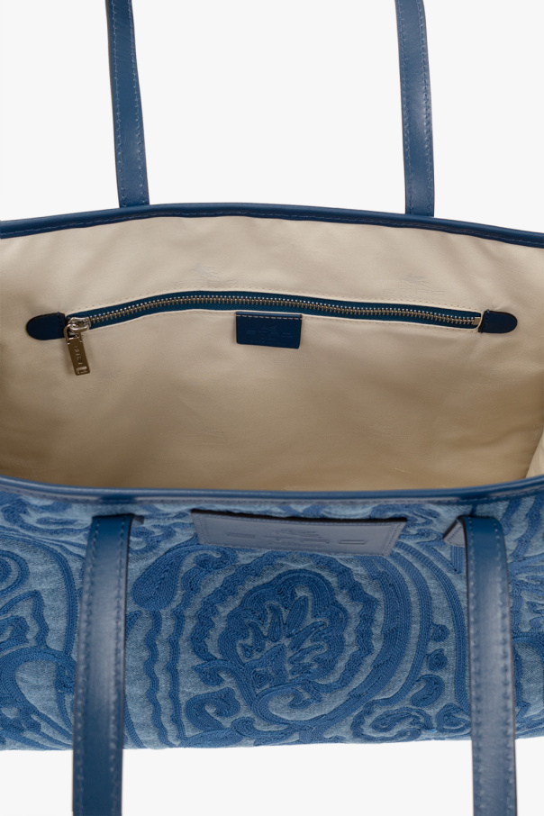 Blue shopper bag from Etro. Rendered in denim and calf leather, this design showcases an embroidered paisley pattern and a logo-embossed patch. It is complete with two half-round handles and one internal compartment with a zip pocket.