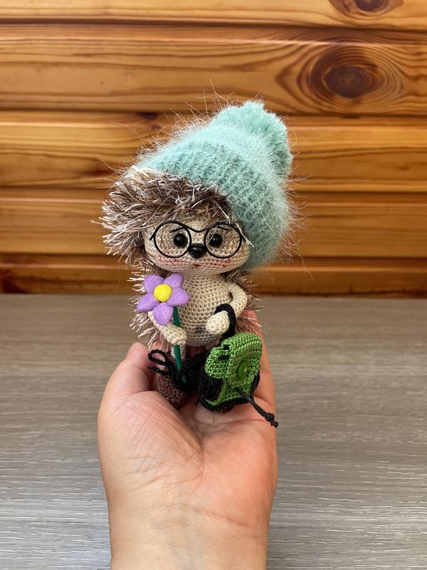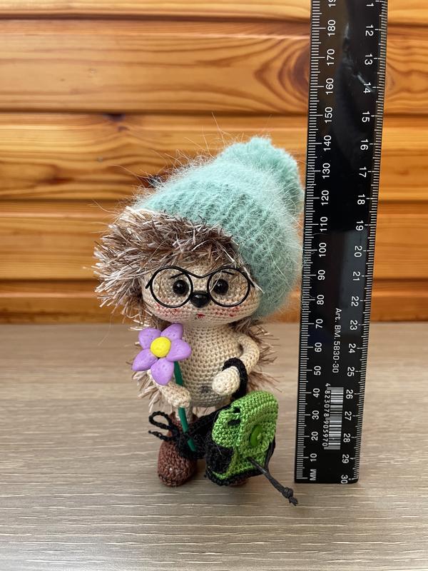 Игрушка связана крючком из хлопковой пряжи и пряжи «травка», наполненная холлофайбером. В руки и ноги вставлена проволока. Шапка, рюкзак, цветок и очки снимаются. Глаза и нос приклеены. Морда тонована. Высота 14 см.