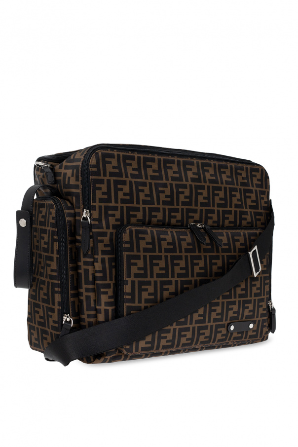 Brown and black changing bag from Fendi Kids. Embellished with a printed monogram, this design secures with a two-way zip and features multiple pockets, an adjustable shoulder strap, silver-tone metal hardware and an included a changing mat. This item can attached to a stroller.