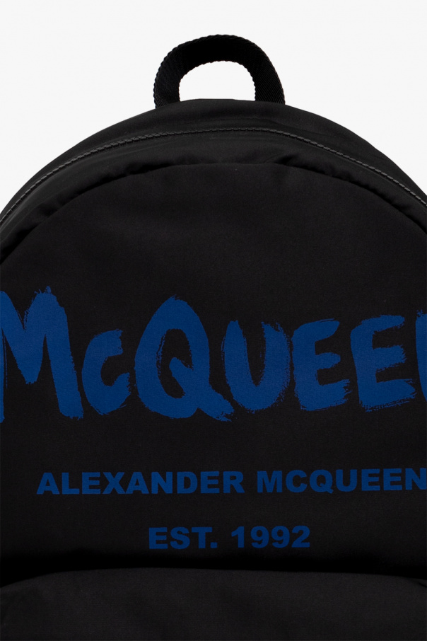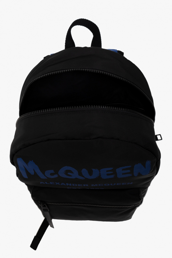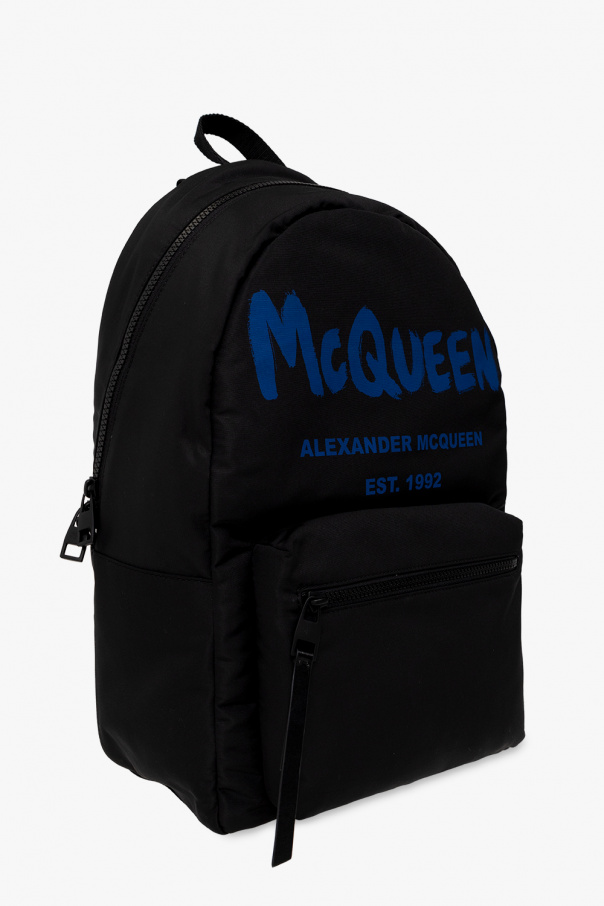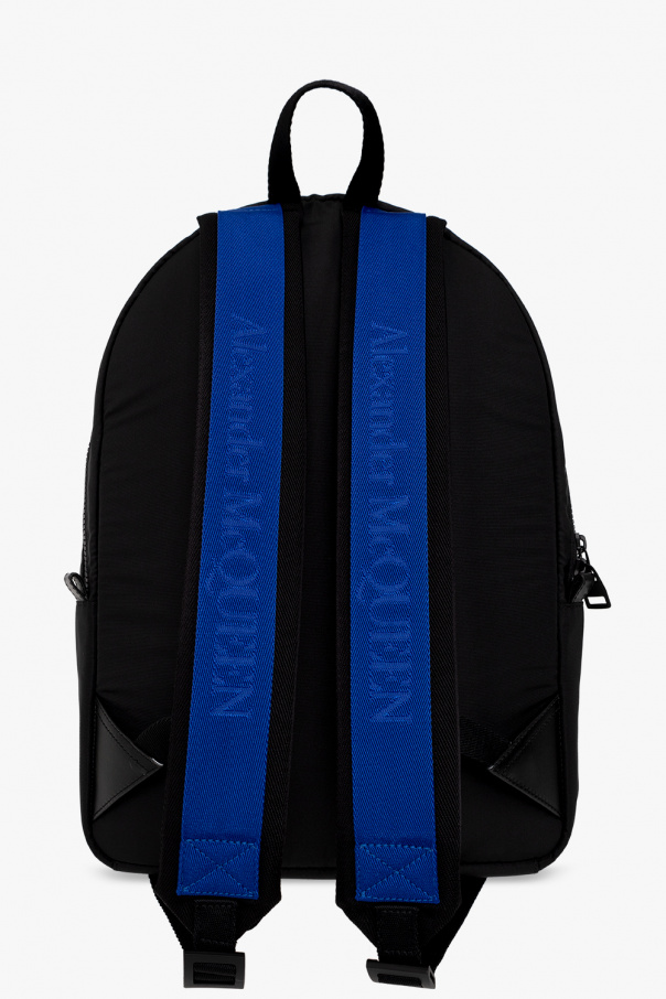Black ‘Metropolitan’ backpack from Alexander McQueen. Fastened with a two-way zip, this model features a dark blue logo print, front zip pocket, black and dark blue, adjustable shoulder straps embroidered with a logo, black metal hardware and one internal compartment with two slip pockets and one card slot.