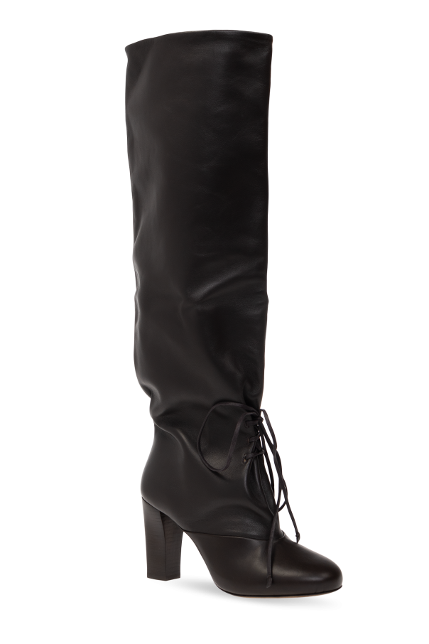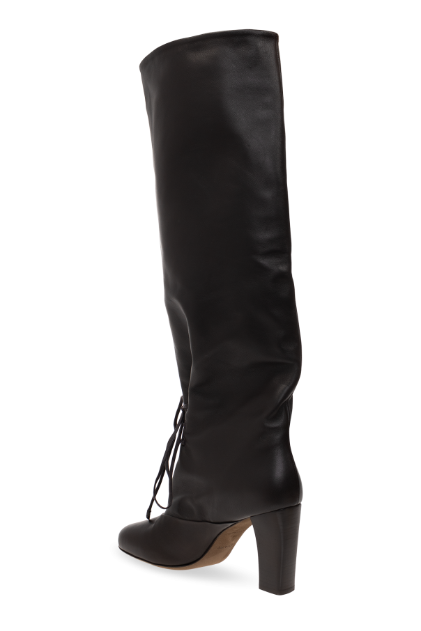 Brown heeled boots from Lemaire. Made from leather with an almond-shaped toe, this model sits on a brown leather sole and features a drawstring upper.