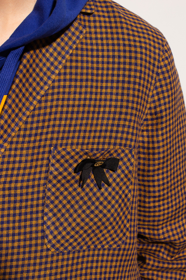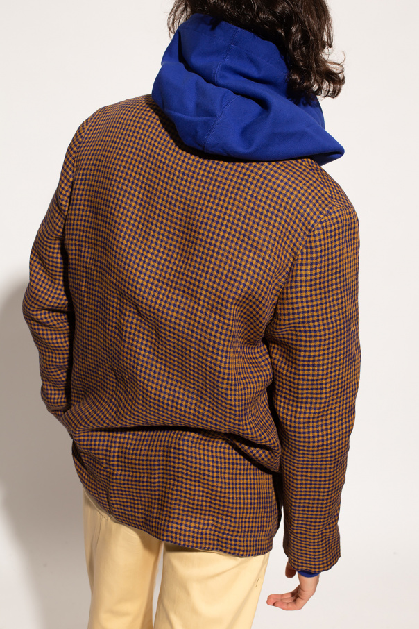 Brown and navy blazer with notch lapels from Gucci. Made of linen, this garment features buttons, a check pattern, detachable logo appliqué in black, three front pockets and long sleeves.