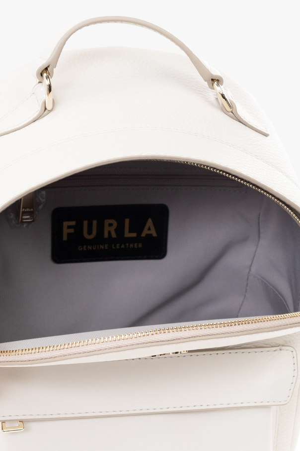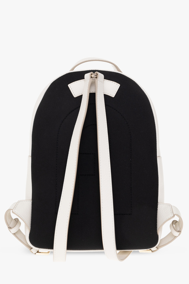 Cream ‘Favola Small’ backpack from Furla. Crafted from leather, this design secures with a zipper and features a zip pocket accompanied at front with a metal logo plaque, a half-round handle, adjustable shoulder straps, gold-tone metal hardware and one internal compartment with a zip pocket.