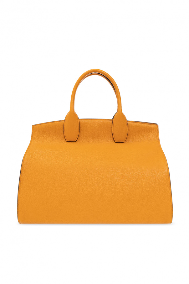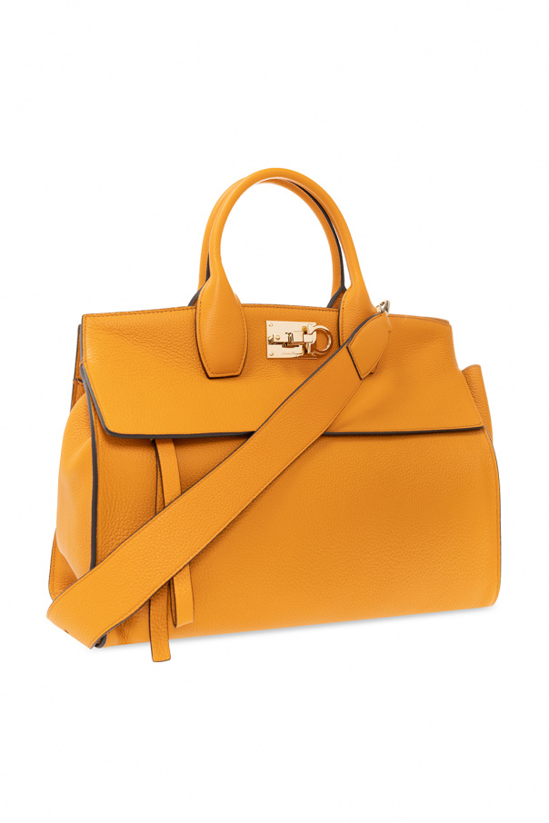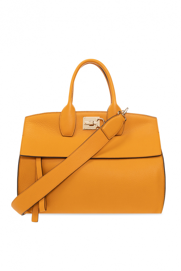 Brownish-orange ‘Studio’ shoulder bag from FERRAGAMO. Crafted from calf leather, this design features the brand\'s signature Gancini fastener, a zip pocket on the front, two half-round handles, a detachable and adjustable shoulder strap, gold-tone metal hardware and one internal compartment with a removable zip pouch.