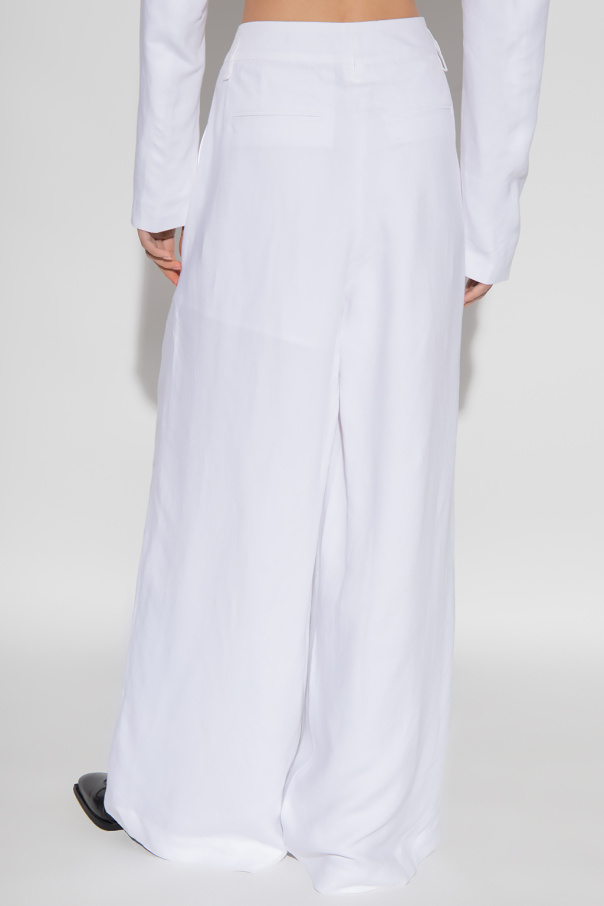 White ‘Lotus’ trousers from Birgitte Herskind. Fastened with a zip, hook and button, this high-waisted pair features pleat details, two pockets, two decorative pockets at the back and wide, straight legs.