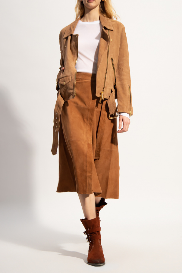 Brown ‘Juva’ suede skirt from AllSaints. Made of suede, this garment fastens with snaps and a buckle belt.