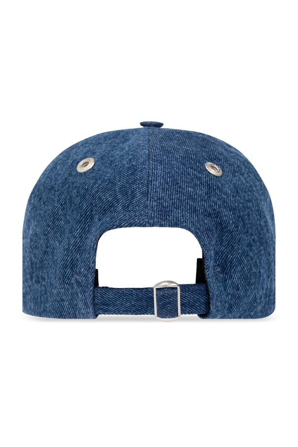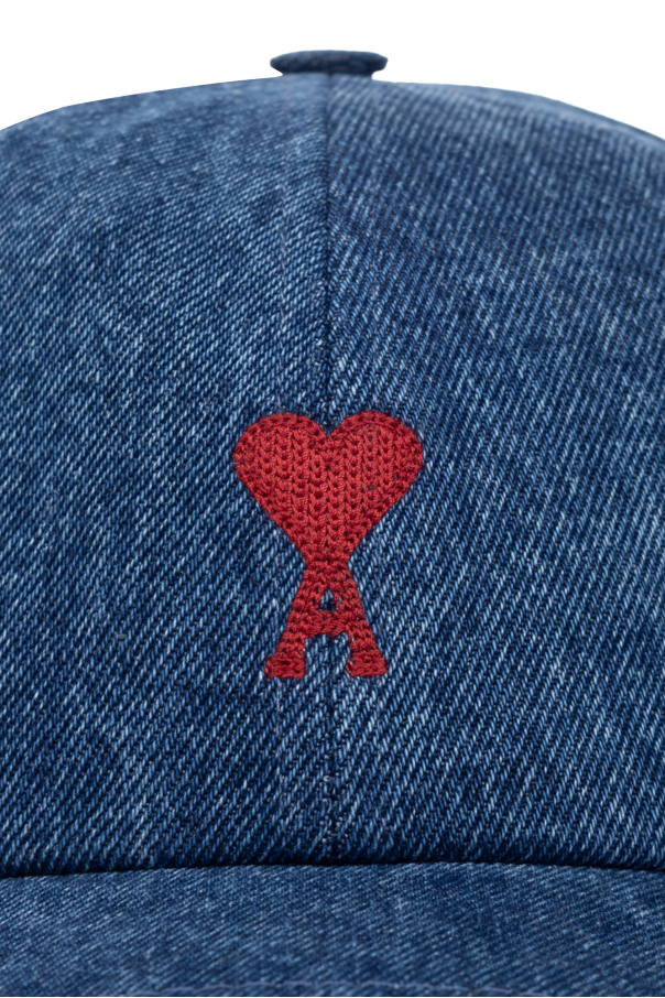 Dark blue denim baseball cap from Ami Alexandre Mattiussi. Made of cotton, this item features a red logo embroidery, adjustable buckle strap at the back and silver-tone metal hardware.