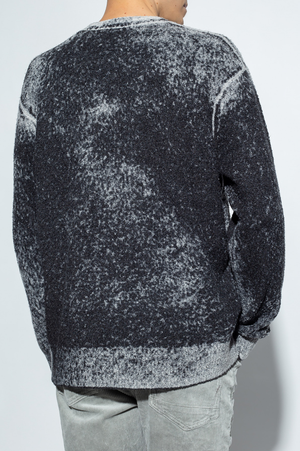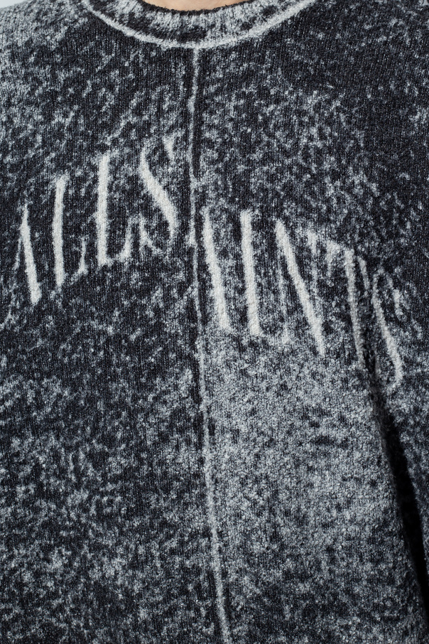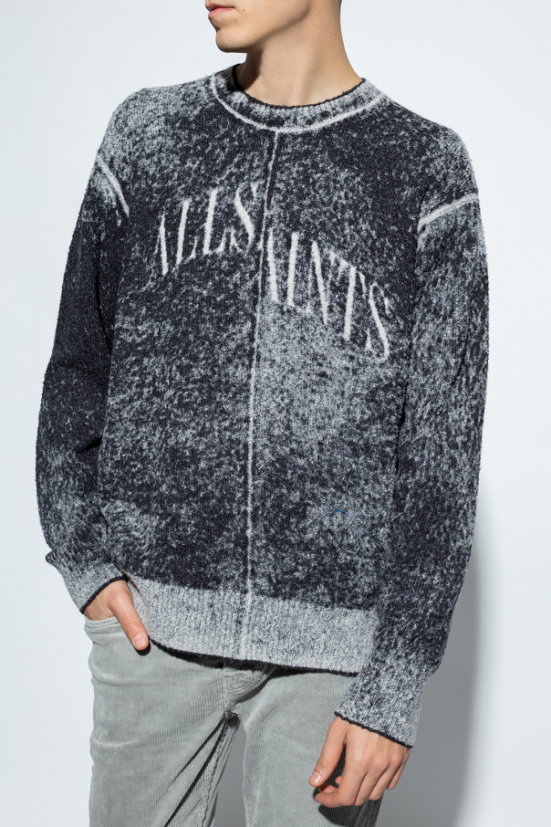 Black and grey ‘Drop’ sweater from AllSaints. Decorated with a logo pattern, this garment features ribbed trims at the round neck, hem and cuffs.