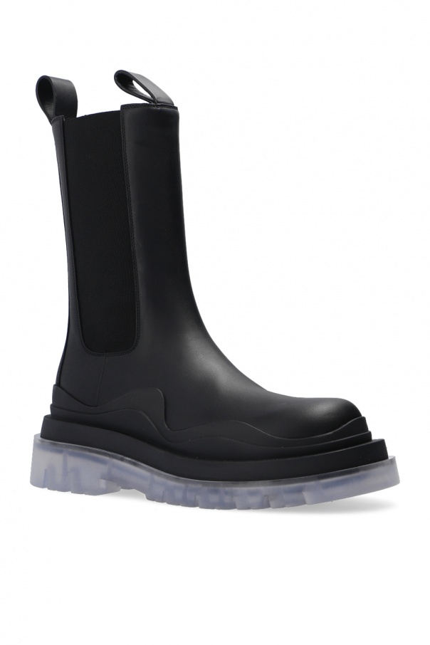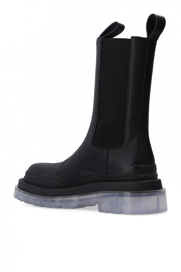 Black ‘The Tire’ platform Chelsea boots from Bottega Veneta. Crafted from vegetable-tanned calf leather, this pair sits on a transparent rubber sole and features elastic panels on the sides.