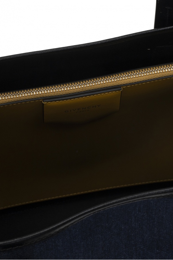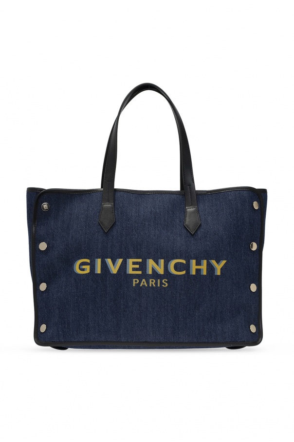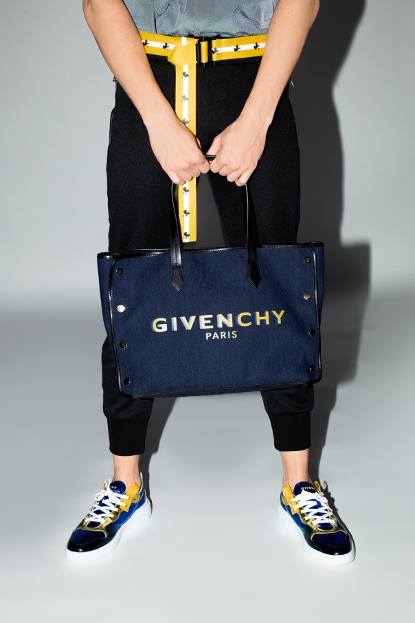Navy blue shopper bag from Givenchy. Printed with the brand\'s logo in yellow and blue, this leather-trimmed design features two half-round handles and interior with one compartment and a detachable zip pouch in yellow.