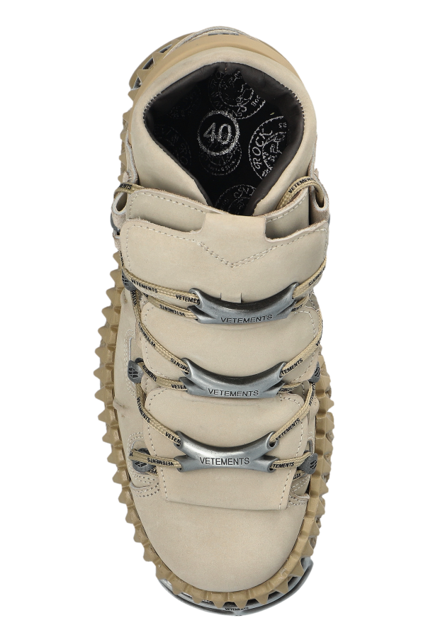 Introducing the Vetements x New Rock footwear, a paragon of avant-garde design intertwined with luxurious craftsmanship. Embodying a bold and chunky aesthetic, these shoes boast a dominant beige hue, perfectly complemented by their sculpted rubber sole adorned with distinctive patterns, exuding an unparalleled uniqueness. Meticulously crafted from premium leather, both the exterior and interior exude opulence. The laces are embellished with metal elements, featuring the iconic Vetements logo on the metallic eyelets, accentuating their exclusivity. These shoes seamlessly fuse classic and futuristic elements, making them an extraordinary addition to any gentleman’s wardrobe. Why Choose This Product? Unique Design: Bold and chunky with a sculpted rubber sole. Premium Materials: Crafted from high-quality leather. Exclusive Detailing: Featuring Vetements logo on metal eyelets. Versatile Style: Combines classic and futuristic elements.