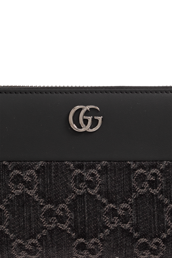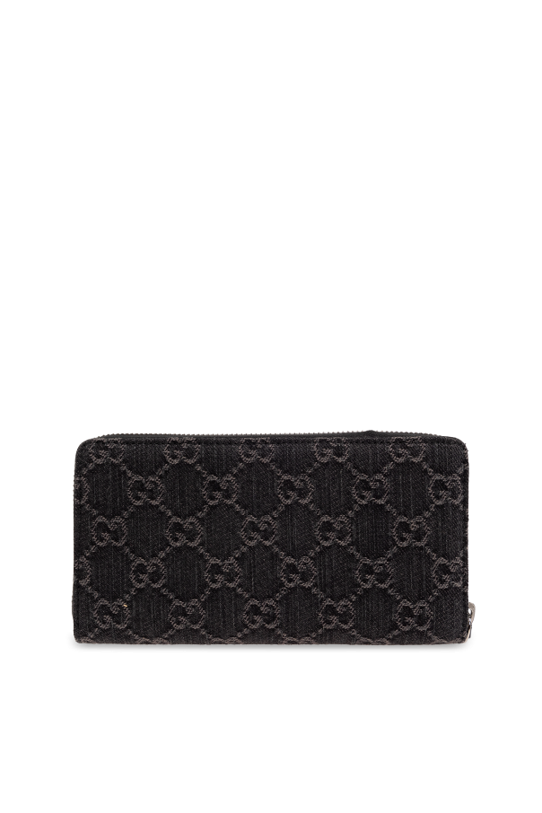 Black and grey wallet from Gucci. Made from cotton and leather, this item fastens via a zip and showcases a monogram pattern accompanied by a silver-tone metal logo plaque. Its interior includes three bill compartments, one zip coin pocket and twelve card slots.