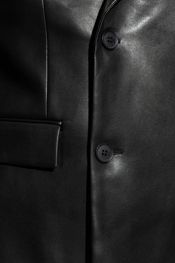 Black double-breasted blazer from MISBHV. Made of faux leather, this design features button fastenings, peak lapels, two flap pockets and two rear vents.