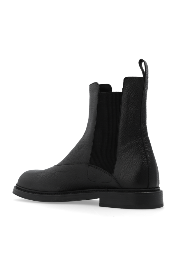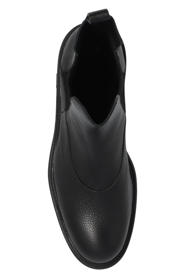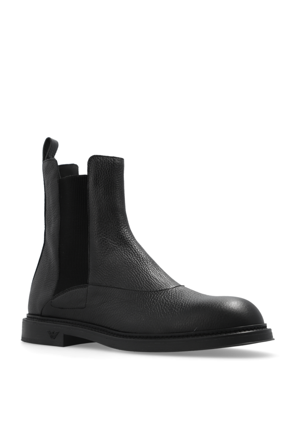 Black Chelsea boots from Emporio Armani. Made of grained leather, this pair features elastic side panels and a black rubber sole with a logo detail.