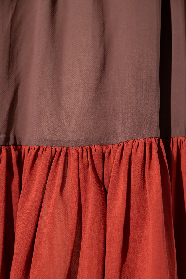 Pink, brown and maroon maxi dress from Nensi Dojaka. Made of cotton, this design features adjustable shoulder straps, open back with an adjustable strap, built-in bra, cut-outs on the sides and flared skirt.
