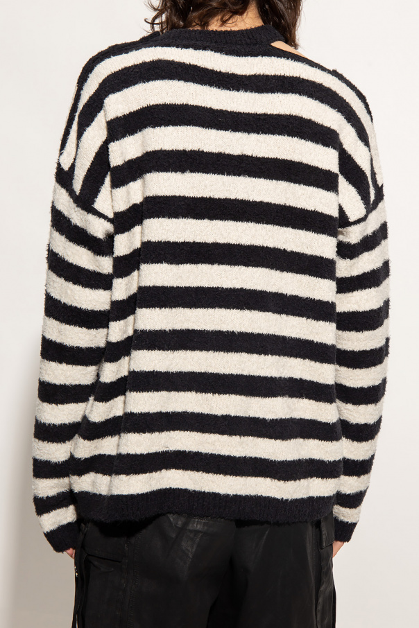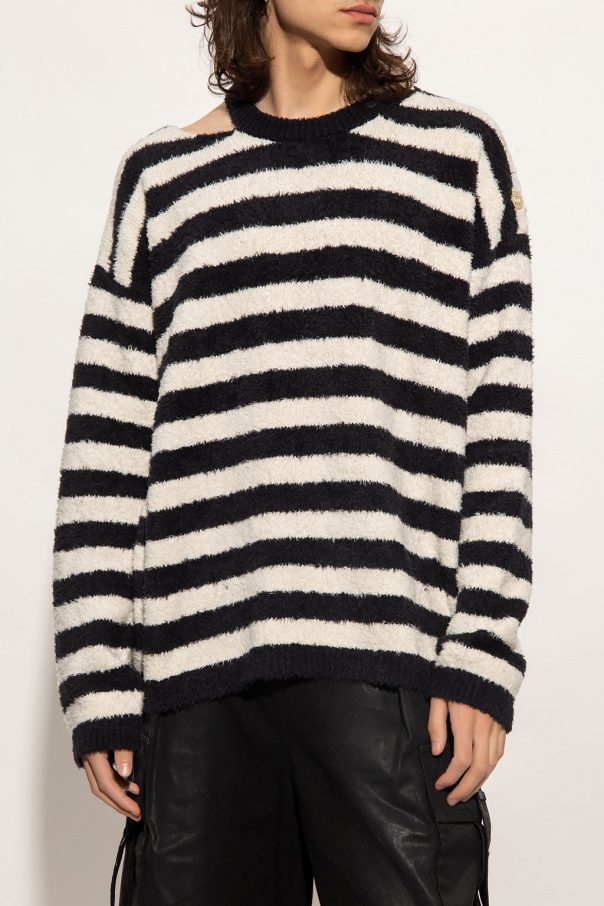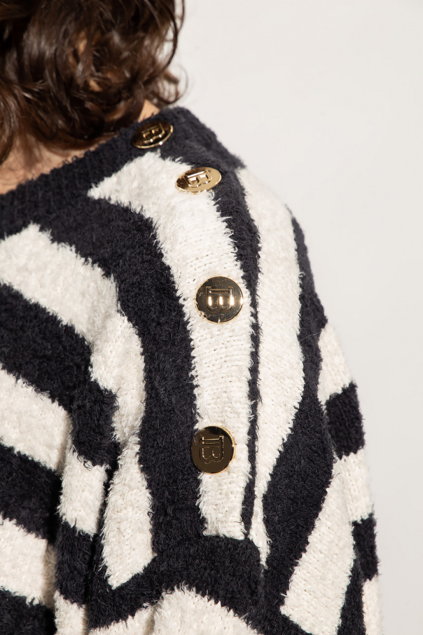 White and black crewneck sweater from Balmain. Made of cotton, this style features an all-over horizontal stripe pattern, decorative snap closures with a tactile logo in gold-tone and ribbed