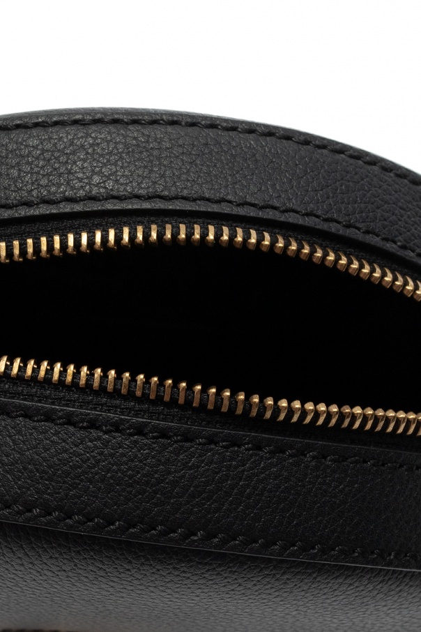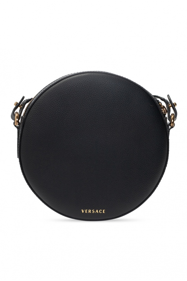 Black \'La Medusa\' round shoulder bag from Versace. Crafted from grain leather, this design features a zip fastening, logo detail, the iconic Medusa head, adjustable shoulder strap and one internal compartment with one slip pocket.
