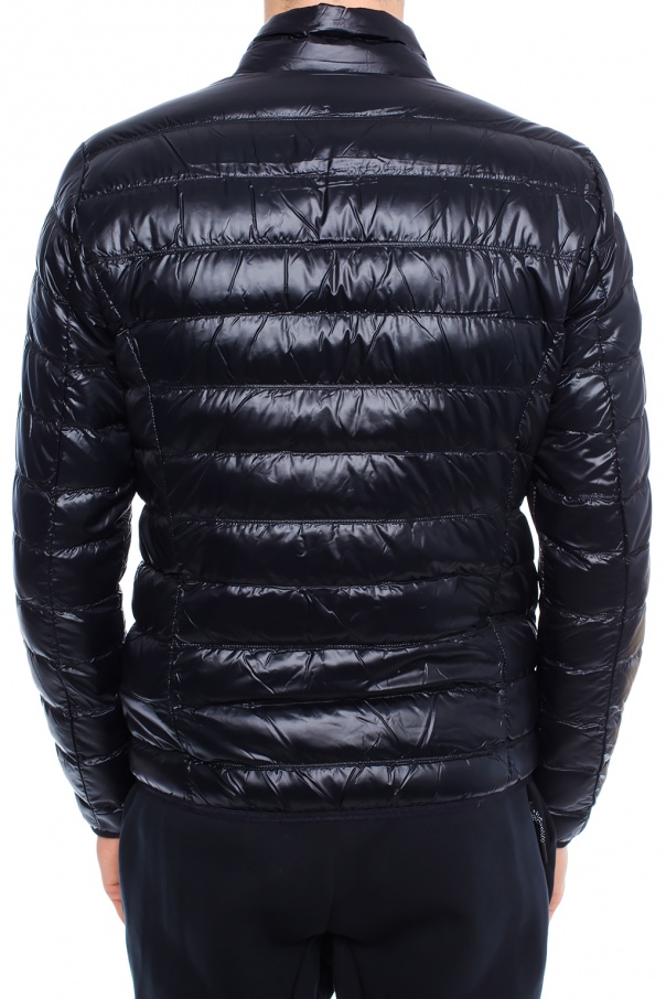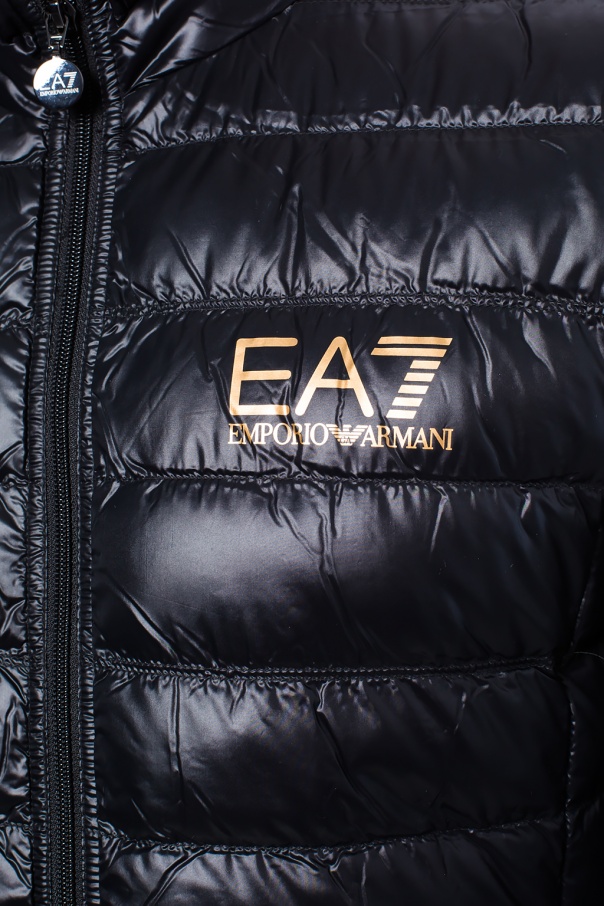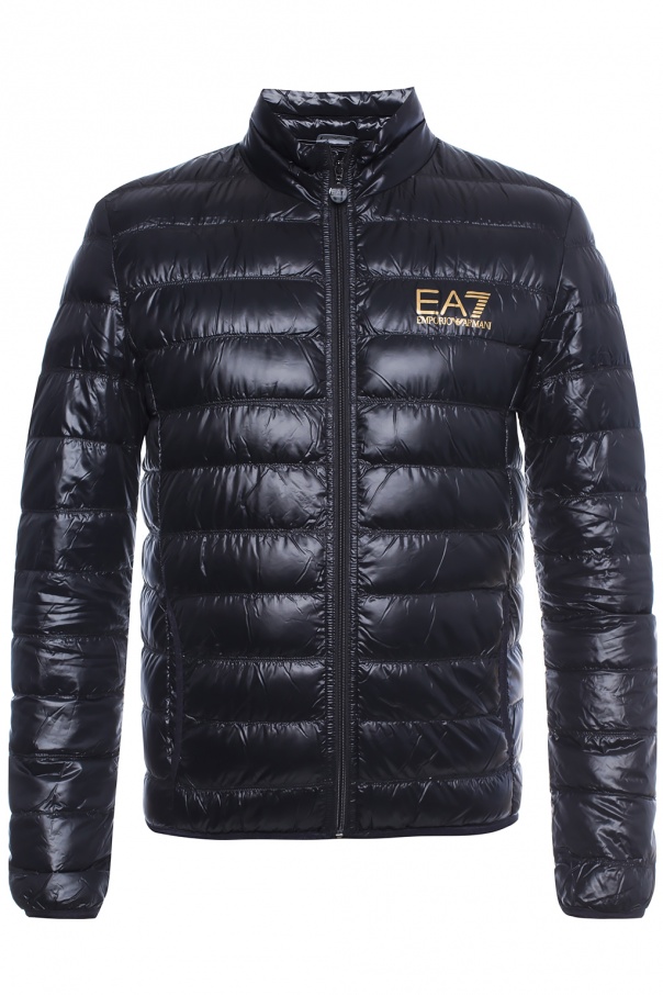 Navy quilted down jacket from EA7 Emporio Armani. Fastened with zip. Enriched by gold-tone graphic print including logo at the front. Features elasticated hem and cuffs and 2 slip pockets at the front.