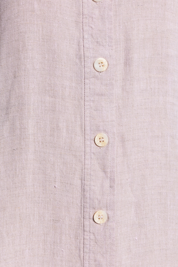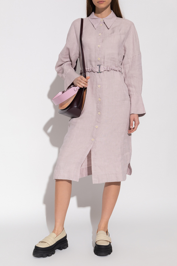Light purple dress from Ganni. Crafted from hemp, this style fastens via buttons and showcases a distinctive frontal pocket and long sleeves with button cuffs. It comes with an elastic belt including a metal buckle.