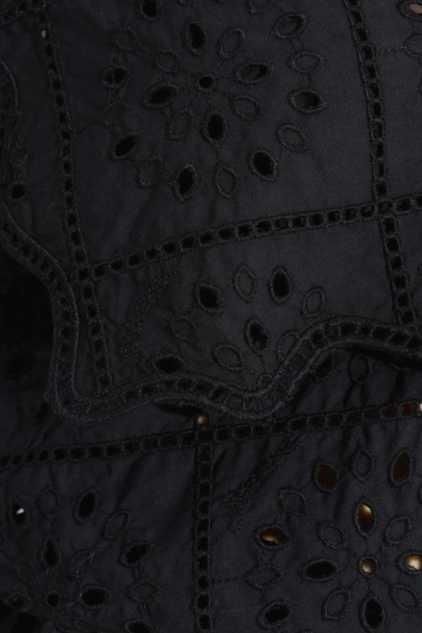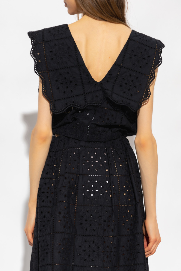 Black sleeveless top from Ganni. Made of cotton, this style features a V-neckline, an elastic hem and openwork detailing with embroidery.