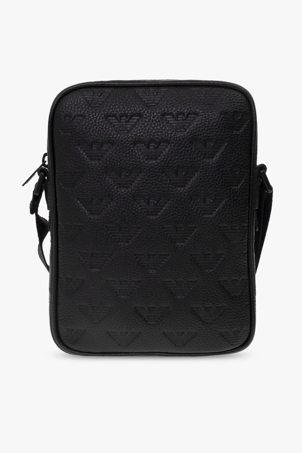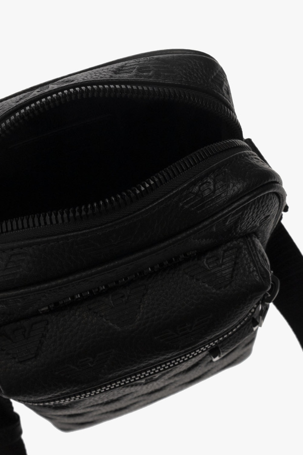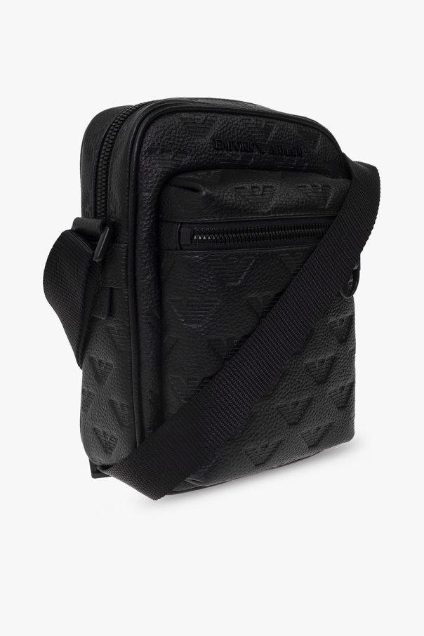 Black shoulder bag from Emporio Armani. Crafted from leather embossed with a monogram motif, this design fastens with a zipper and features a metal logo plaque accompanied by a zip pocket on the front, an adjustable strap, black metal hardware and one internal compartment with a slip pocket.