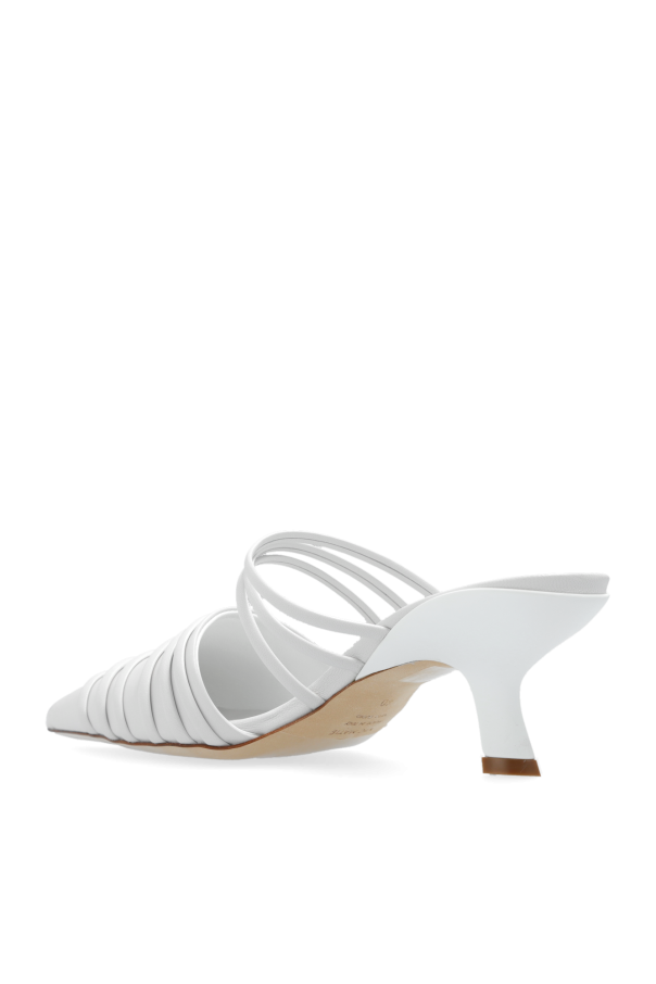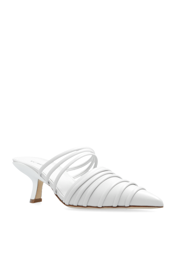 White ‘Bonbon’ mules from Vic Matie. Made of leather with a pointed-toe silhouette, this model sits on a beige leather sole and features decorative thin straps.