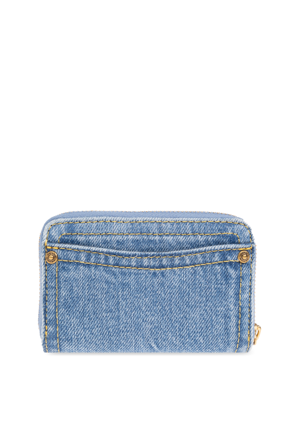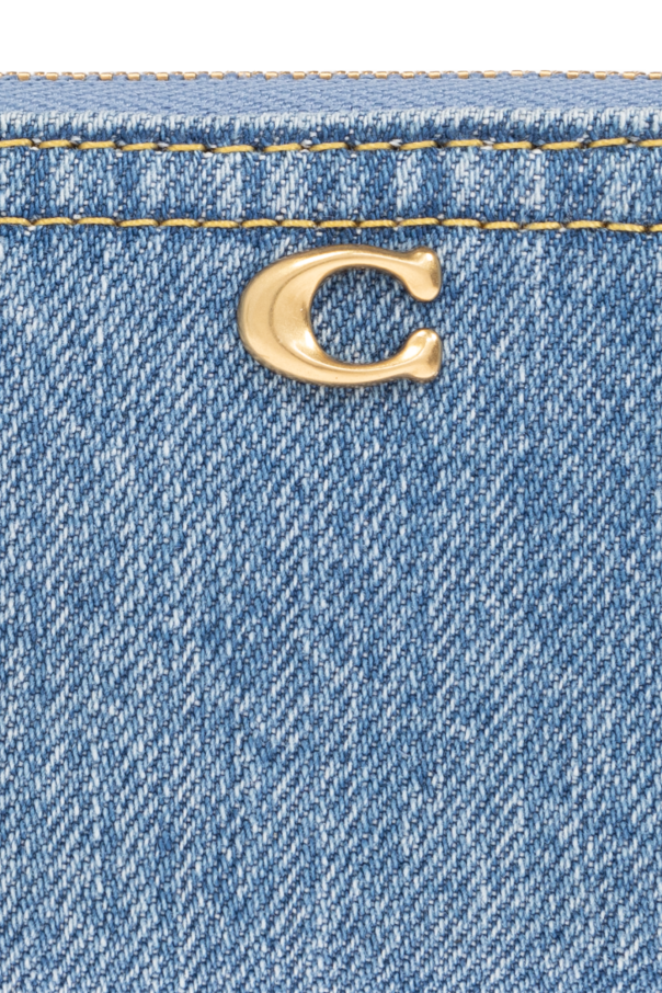 Blue card case from Coach. Made of denim, this item fastens via a zip and showcases a logo-shaped application on the front, one card slot on the back, gold-tone metal hardware as well as an interior with three pockets and two card slots.