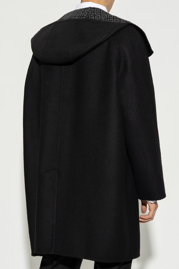 Black hooded coat from Givenchy. Made of a wool, cashmere and silk blend, this garment features a decorative zip with a 4G motif, two front pockets, hood with velcro fastening, long sleeves and lining with a grey monogram pattern.
